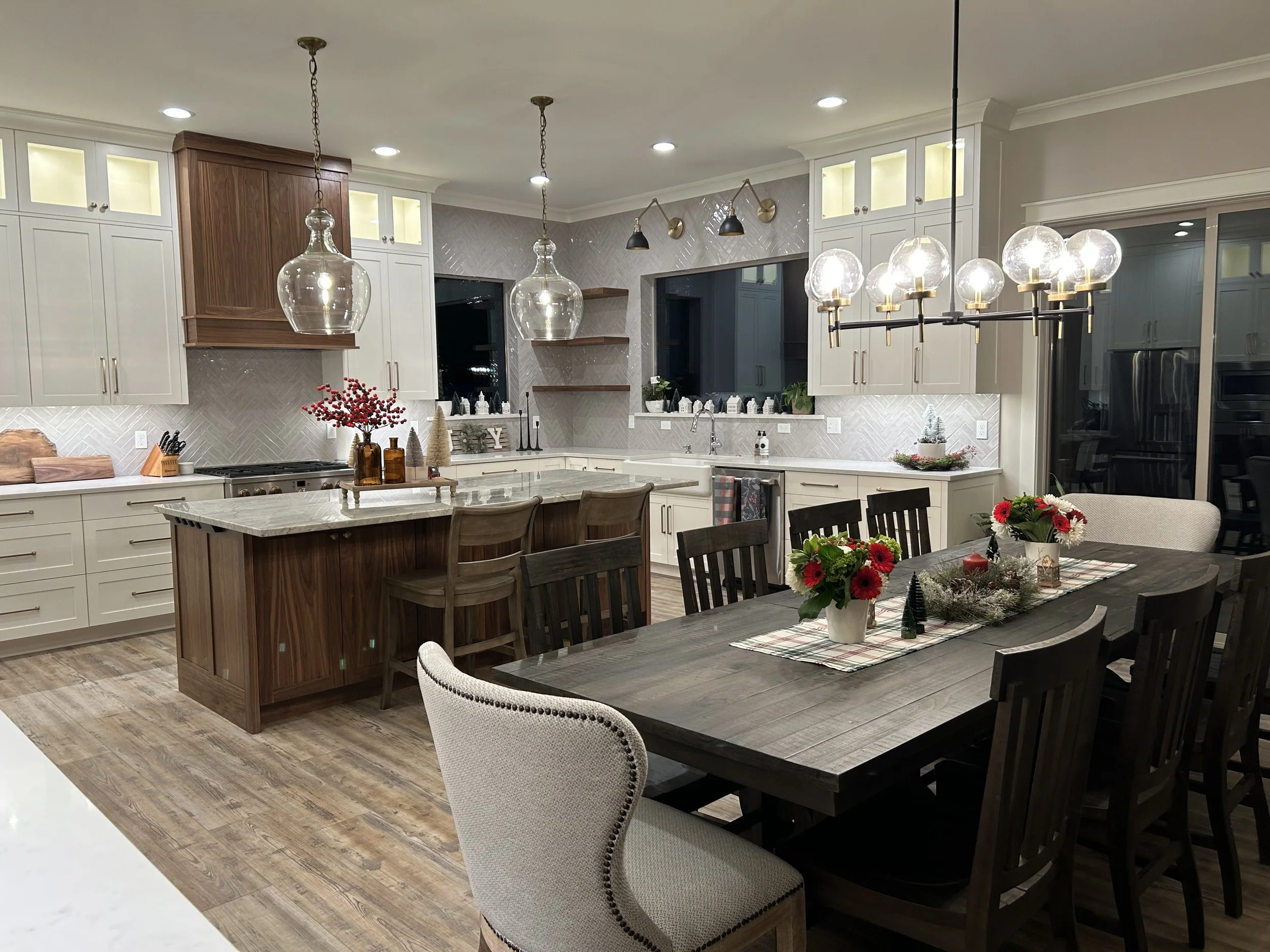 The living room and entry of the home boast a 26 foot ceiling with a centered three-sided fireplace made out of Eldorado stone. It’s stunning how the light comes into the space! The decor throughout, gives a nod to the beautiful farmlands of the valley.
